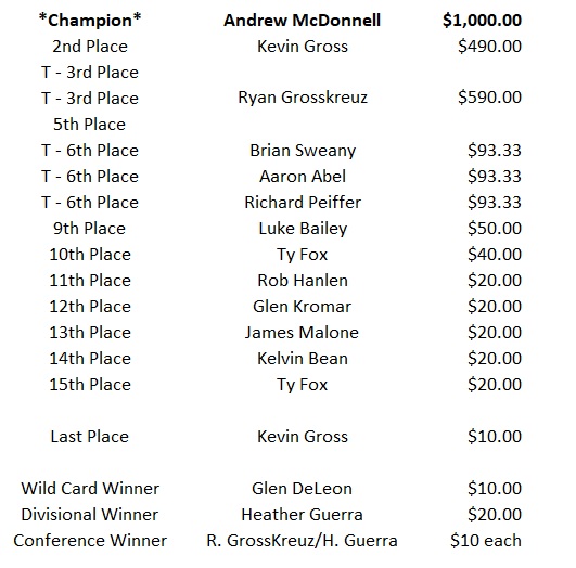I will finalize the payout sheet tonight and will get with all the winners tomorrow so we can get your winnings to you as quickly as possible.